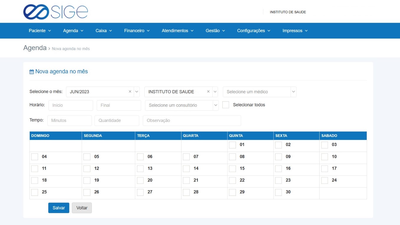 Para melhor entendimento, leia o artigo completoAcesse a seção AGENDA e selecione a opção GERENCIAR AGENDA. Em seguida, clique em NOVA AGENDA NO MÊS. Preencha os campos com o mês desejado, selecione a clínica e o profissional. Defina os horários de abertura e encerramento da agenda, assim como a quantidade de vagas disponíveis por dia. Lembre-se de repetir o processo para definir um horário de almoço, criando dois agendamentos separados para a manhã e a tarde.